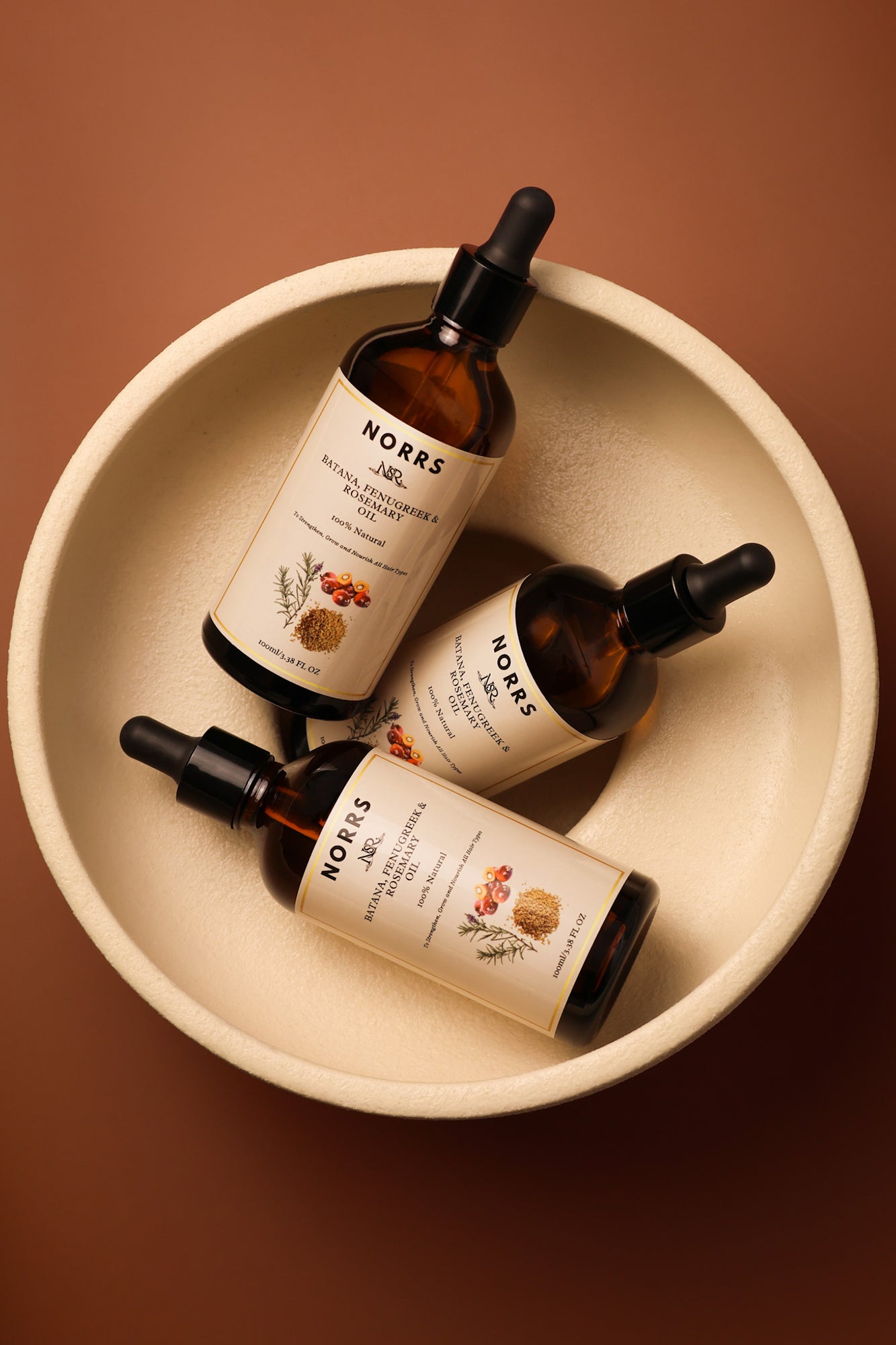 100% natural, cold-pressed oil blend containing, batana, fenugreek seed, rosemary oil, castor oil, coconut oil, jojoba oil, almond oil, argan oil, cloves and lavender essential oil.